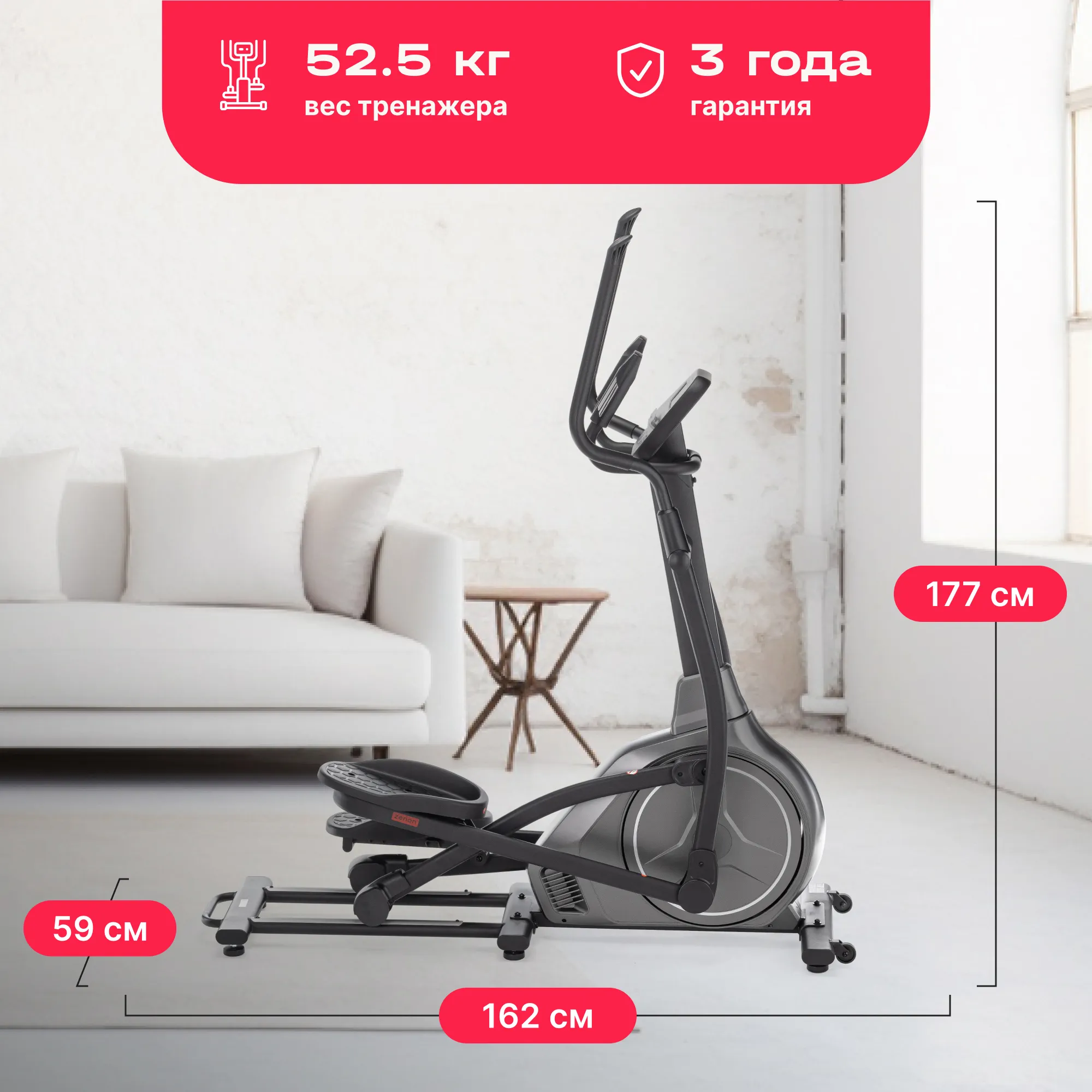 Дополнительные функции, такие как сенсорные датчики на поручнях для измерения пульса и сопряжение с нагрудным кардиодатчиком Bluethooth (приобретается отдельно), делают тренировки более эффективными и удобными. Интеграционные технологии Bluetooth позволяют использовать тренировочные мобильные приложения Kinomap™ и Zwift™ для разнообразия и мотивации. С высокопрочной рамой, ударопрочным пластиком и максимальным весом пользователя до 140 кг, этот тренажер идеально подходит для домашнего использования. Длина шага составляет 420 мм, а расстояние между педалями - 60 мм.